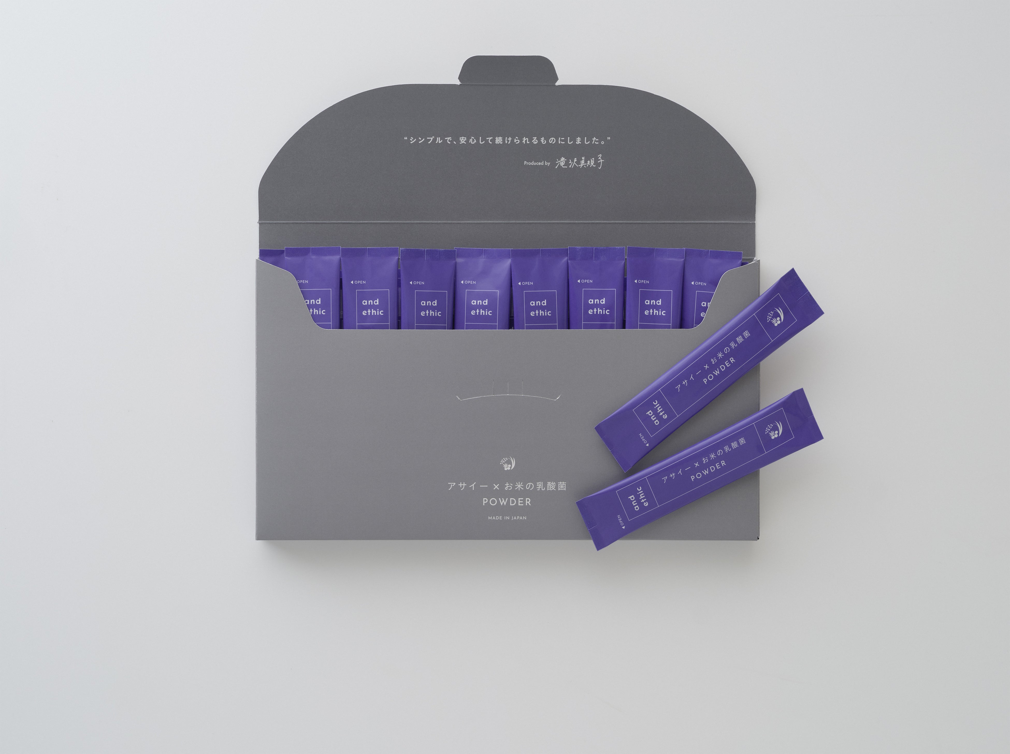 and ethic(アンドエシック)は「想いをつなげてエシカルがひろがっていく」をテーマとし、同じ想いを持つ企業と人が一緒になりさまざまなコラボ商品を開発していくことをコンセプトに、mima株式会社(所在地:東京都港区 代表:松本 毅史)が新たに立ち上げたブランド。その第1弾である本品は、滝沢眞規子さんが理想とする「日々使い続ける、安心できる」という想いを商品化しました。フルッタフルッタ社(所在地:東京都千代田区 社長:長澤 誠)のアサイーパウダーと、山形県置賜地区で無農薬栽培されたササニシキを使用した、COBO社(所在地:神奈川県横浜市 代表:植田 夏雄)の自然発酵乳酸菌を配合して作られた製品です。自然発酵乳酸菌は水分を抜いて眠った状態にしている“生きた乳酸菌”。善玉菌を補給して腸内環境を豊かにすることで健康力を高め、またアサイーの豊富な栄養素を取り込めるからだづくりをサポートします。