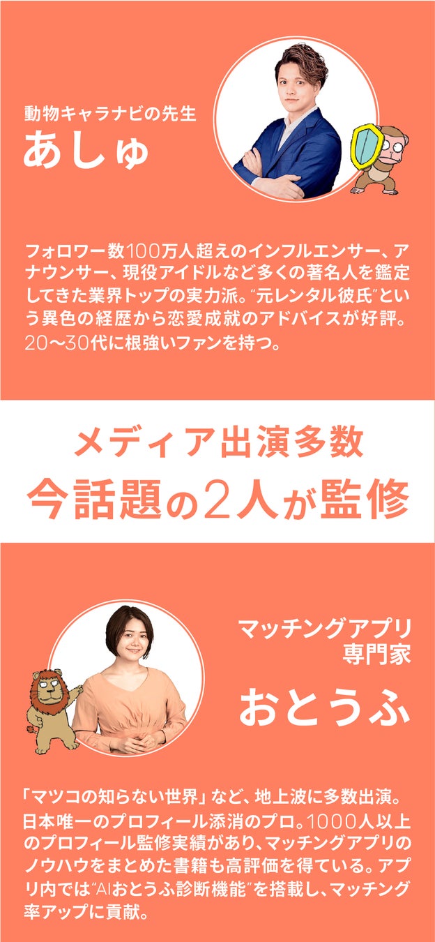 動物キャラナビのプロ「あしゅ」とマッチングアプリ専門家「おとうふ」が監修。