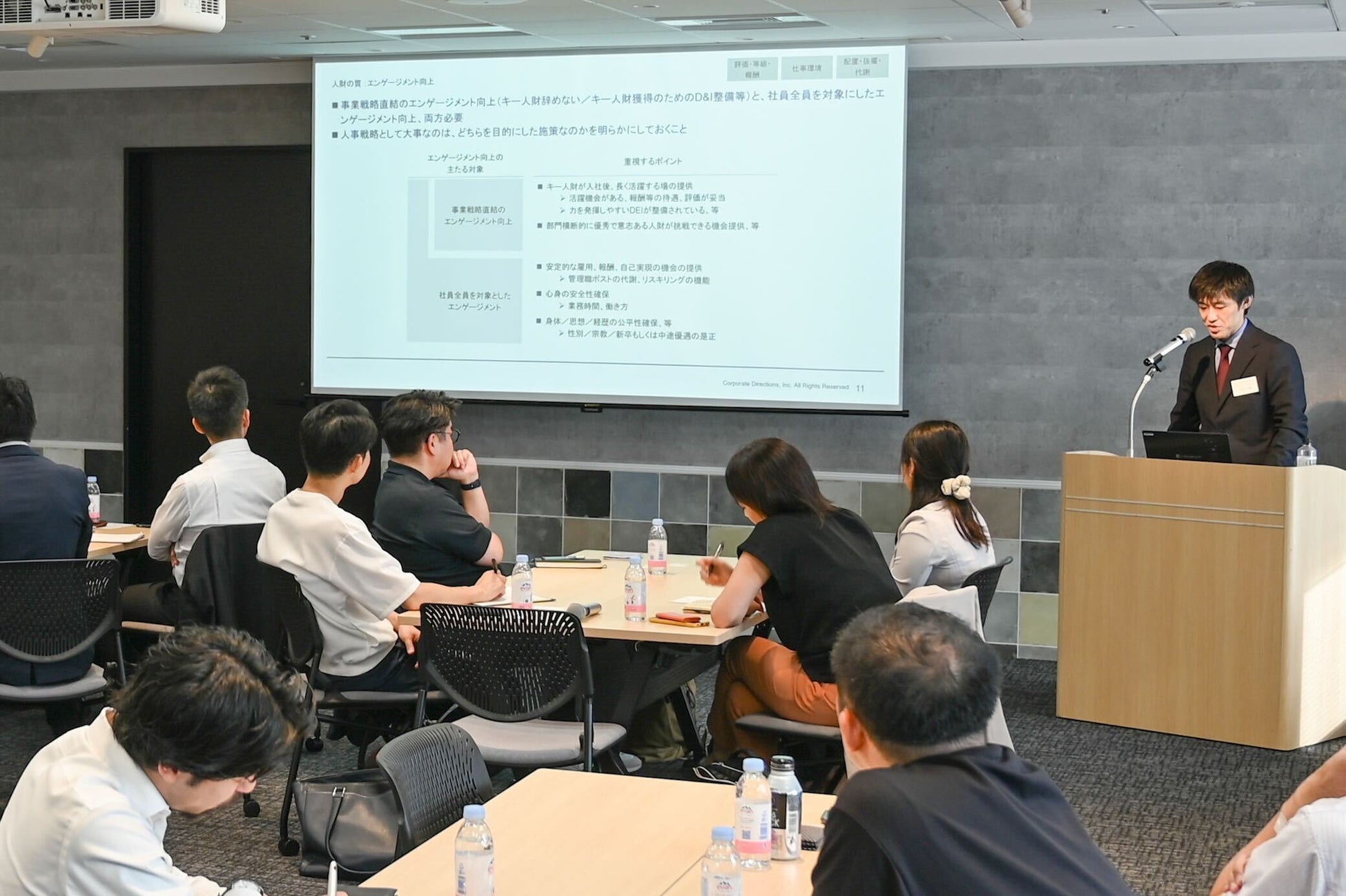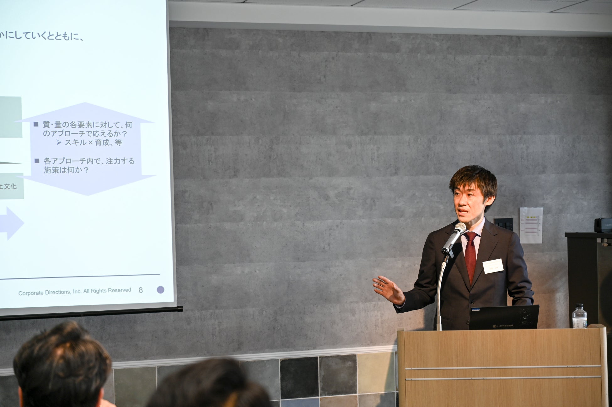 セミナーでは、まずCDIの芳賀から「事業と人・組織の戦略はなぜ遠いか」をテーマに、検討・調査事例も交えつつ話しがありました。