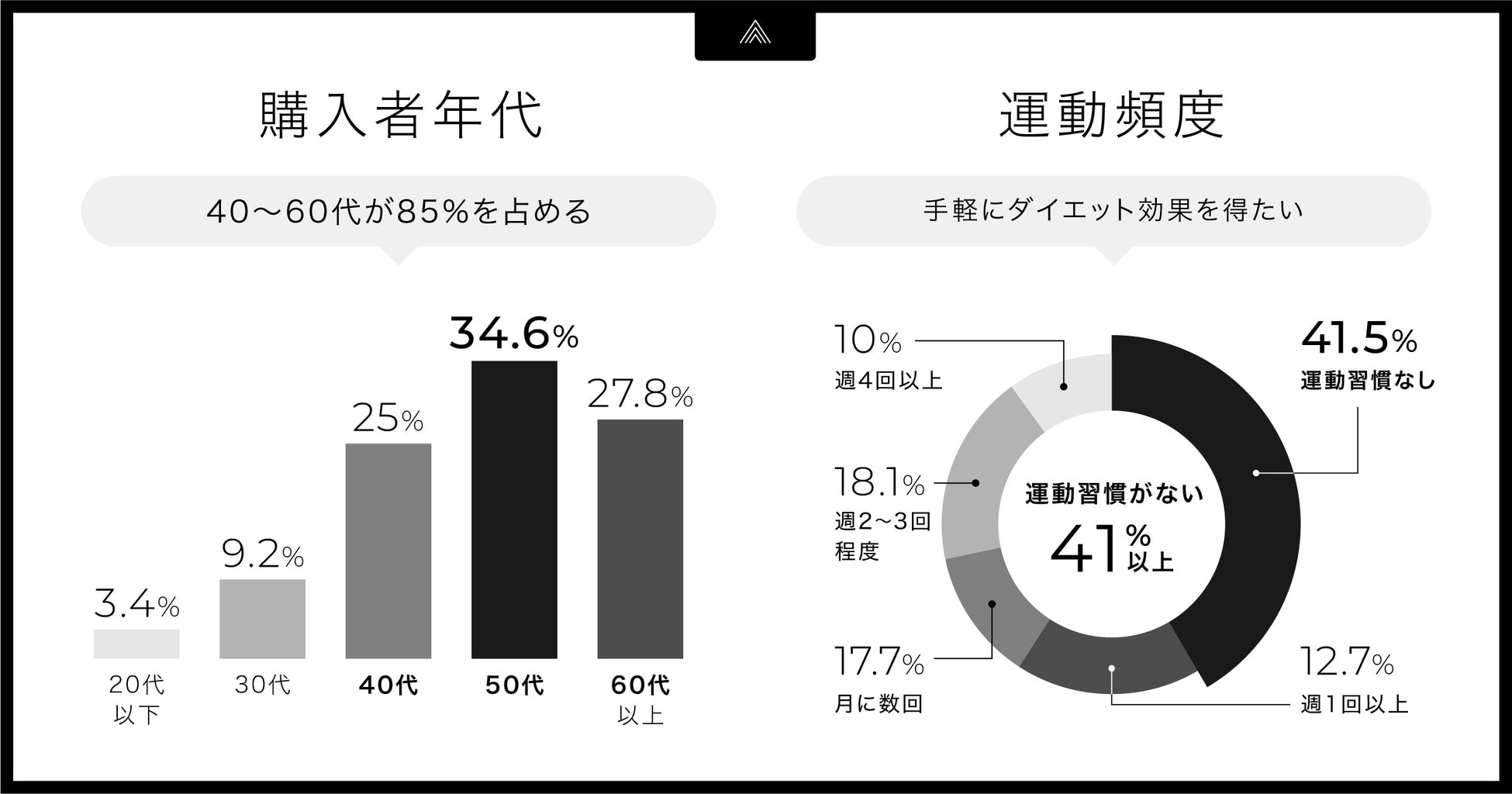 30〜60代のユーザーが85%を占めており、そのうち4割の方は運動習慣がなく、手軽にダイエット効果を得たいと考えています。