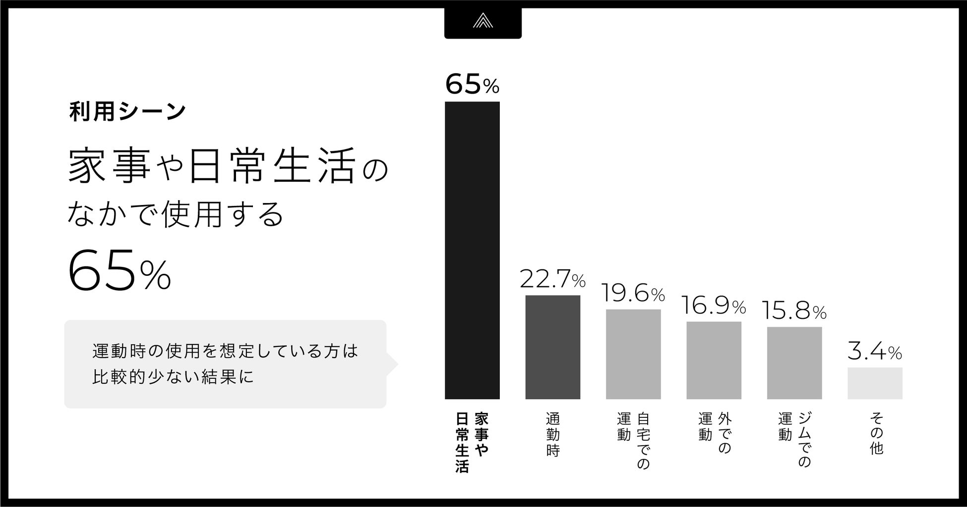 家事や日常生活の中で使用する方が65%と最も多い結果となりました。次いで、通勤時の使用が多く、一方で運動時を想定している方は比較的少ないことがわかりました。