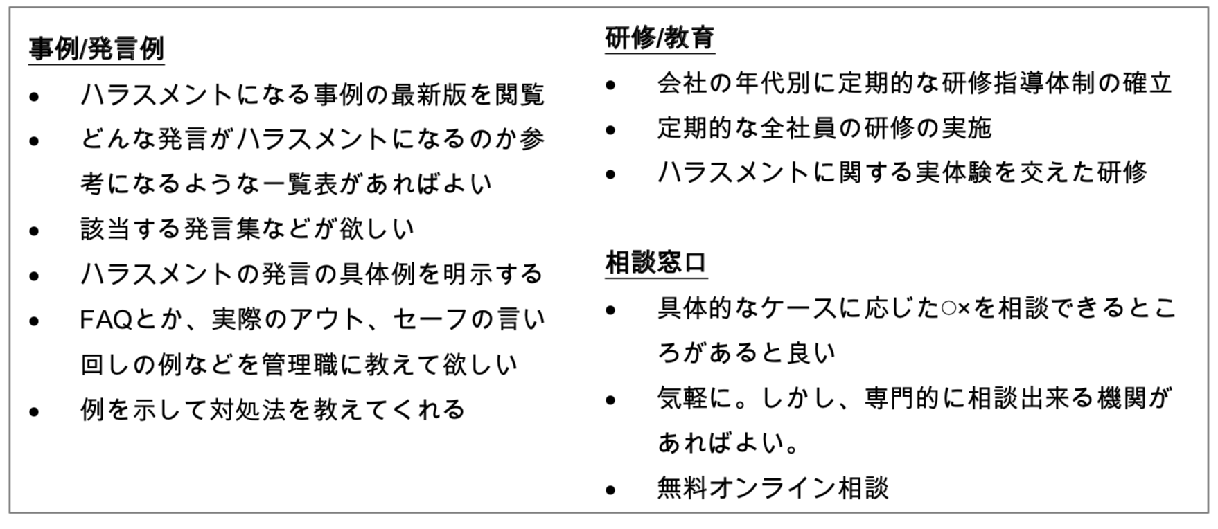- 最も望まれているサポートは「事例/発言例」、 “アウトとセーフの線引き”を知りたいニーズが高い