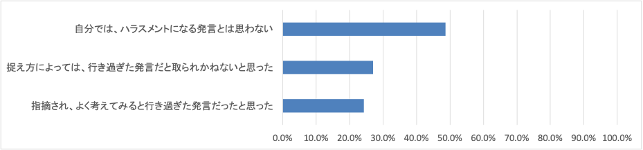 - 約半数の上司が「もしかしたら、部下から『ハラスメントです』と指摘されるかもしれない発言をしてしまった」と思った経験をしている