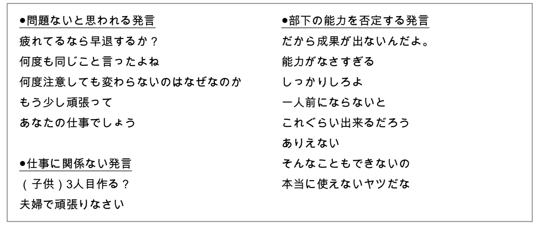 「ハラスメント」と指摘されるかもしれない、と感じた具体的な発言について聞くと、仕事に関係ない発言や、部下の能力を否定する発言などもありましたが、特に問題ないと思われる発言も含まれていました。