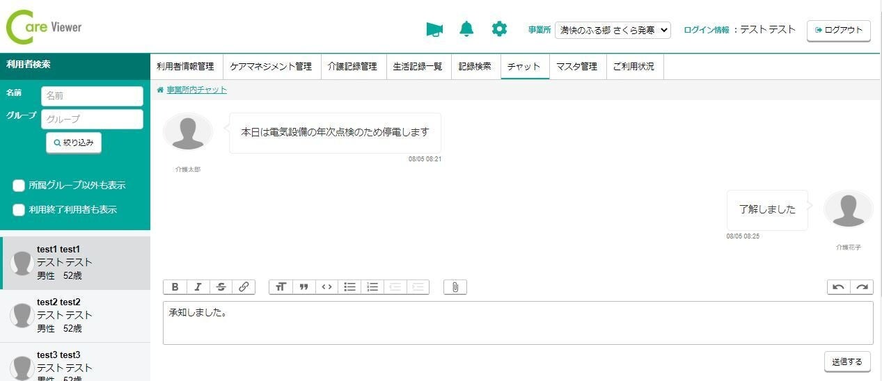 例えば、「CareViewer」にログインしている介護太郎さん(仮名)が投稿したメッセージ「本日は電気設備の年次点検のため停電します」は、「Chatwork」にログインしている介護花子さん(仮名)が、介護太郎さんのメッセージへの返信として投稿したメッセージ「了解しました」と、同じ画面で、発信順に表示されます。