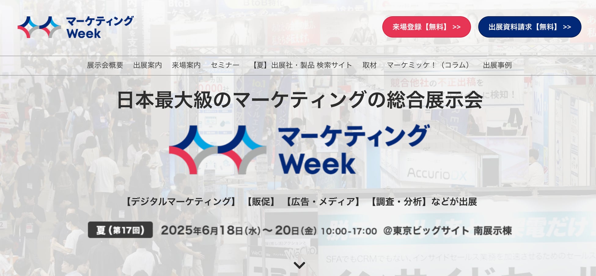 マーケティングWeek -夏 2025-は9つの専門展で構成される日本最大級のマーケティングの総合展示会です。マーケター・Webディレクター・宣伝・広報・営業推進とマーケティング支援サービスのプロが出会うビジネスマッチングの場として、売上アップ・ブランディング・集客力アップなど、企業の課題解決に絶好の機会をご提供します。