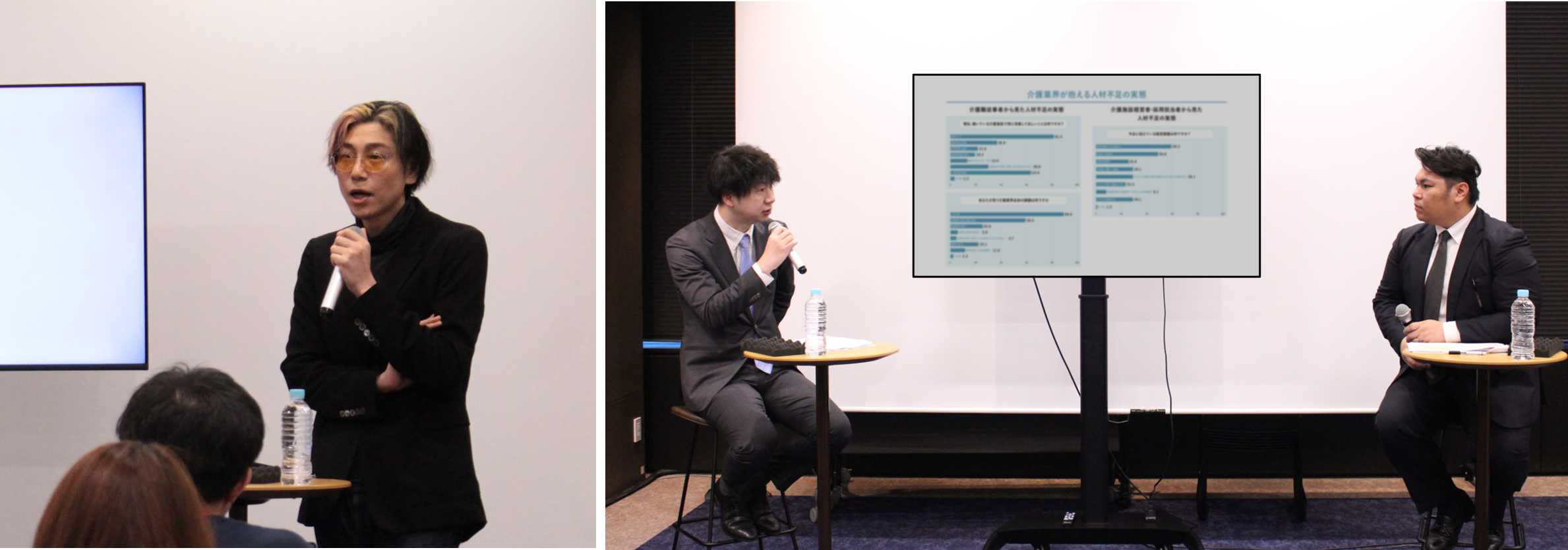 その後は、介護業界の実態について調査結果をもとに解説し、介護福祉士として実際に介護職従事経験もある事業部長の津村と株式会社EE21 入江氏がトークセッションを行いました。そこでは、人材不足によって実際に介護職の現場ではどのようなことがおこっているのか、また、最近の求職者の需要や専門スクールで聞かれる従事者の想いなども語られました。
