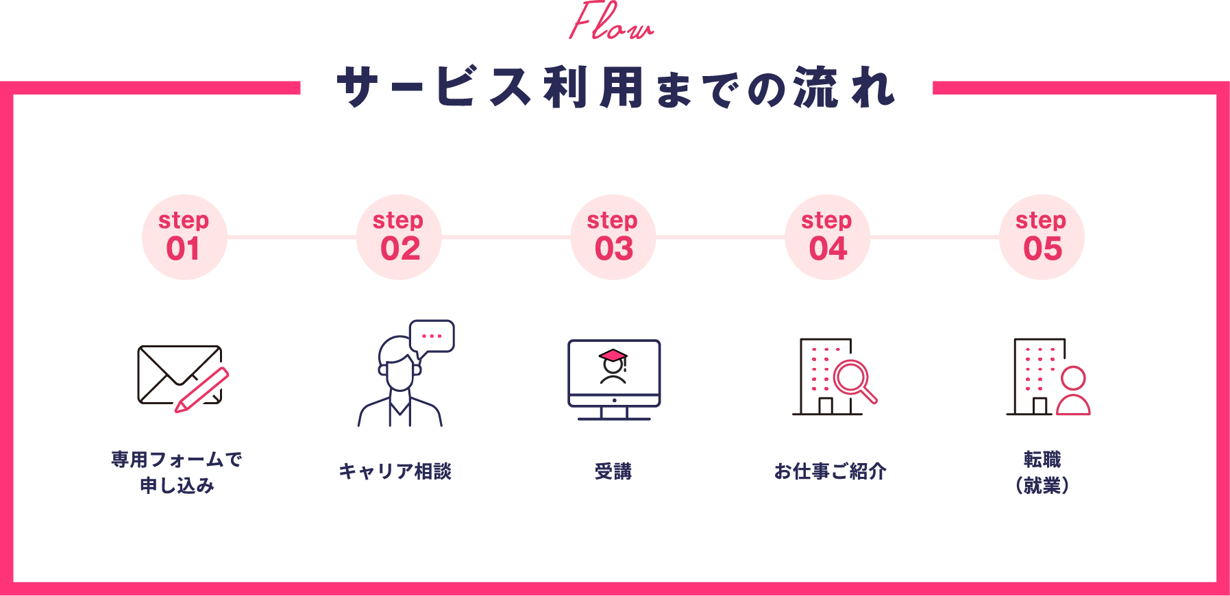 サービスの流れ :①ご応募 ②面談 ③リスキリング講座受講