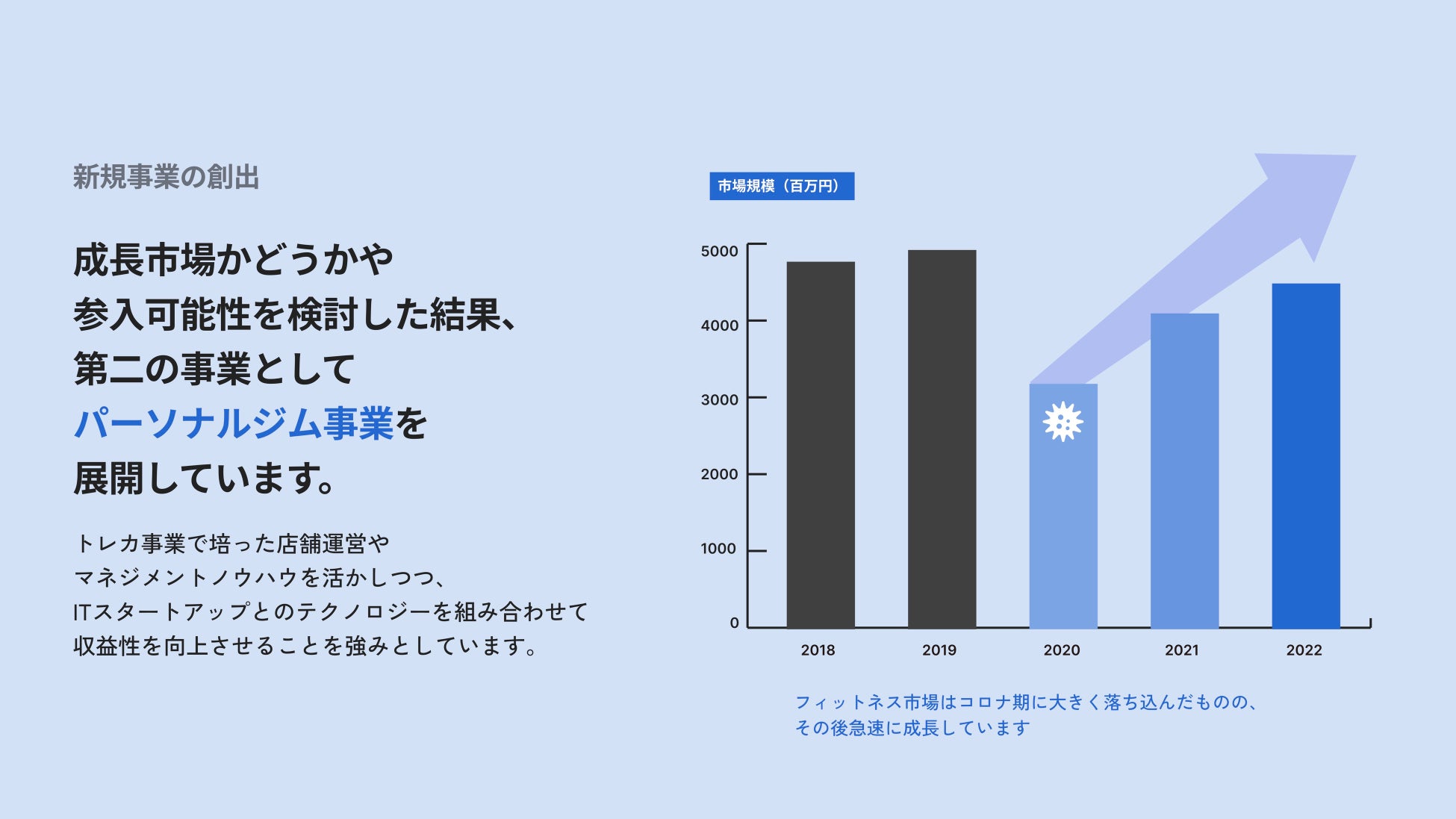 また、当社はトレーディングカード市場だけでなく、多角的な事業成長のもと、パーソナルジム事業も展開しています。2024年9月現在で全国に10店舗のパーソナルジムを構えています。パーソナルジム事業は成長市場であり、トレーディングカード事業で培った当社の店舗運営のノウハウやピープルマネジメント、ITテクノロジーを組み合わせることで当市場においても確実な成長を続けています。