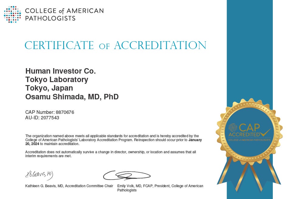 東京衛生検査所(株式会社Human Investor、東京都文京区)が新型出生前検査(NIPT)において2022年4月にCAP認証を受けました。