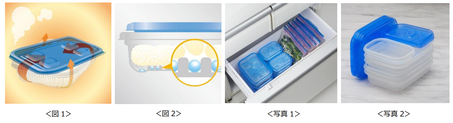 ③薄型で冷凍室保存も収納もスッキリ(※写真1、2)
