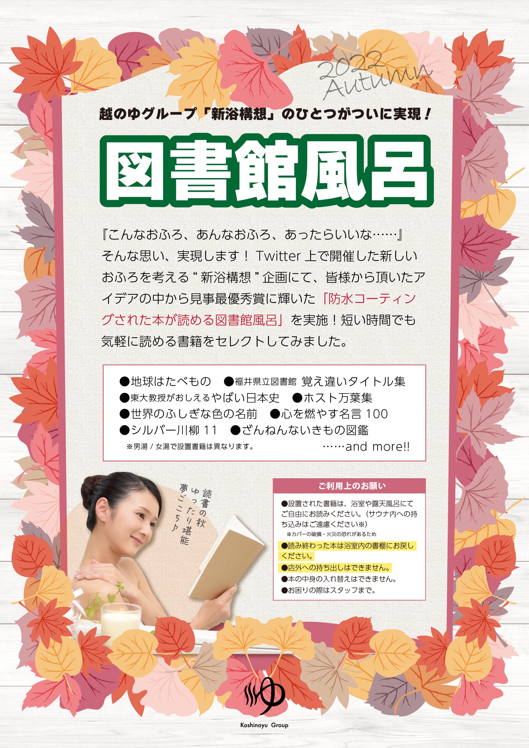 越のゆグループ(イワシタ商事株式会社・イワシタ物産株式会社、福井県福井市、代表取締役社長 岩下大介)では、お風呂で本が読めるイベント「図書館風呂」を開催いたします。
