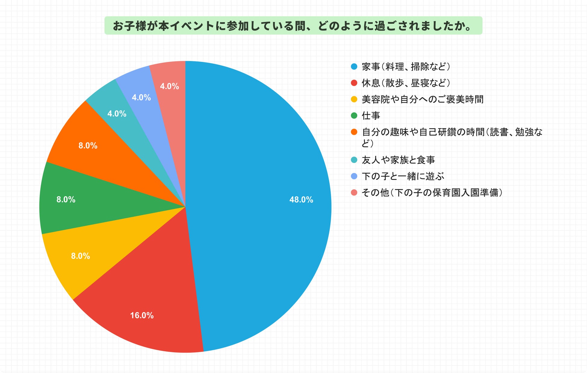 NPSスコアは平均8.6点と参加者の満足度は非常に高く、「子どもが楽しんで参加できた」という声をたくさんいただきました。また、本サービスが、家事や休息などの保護者様の息抜きの時間としてしっかり機能したことも確認できました。