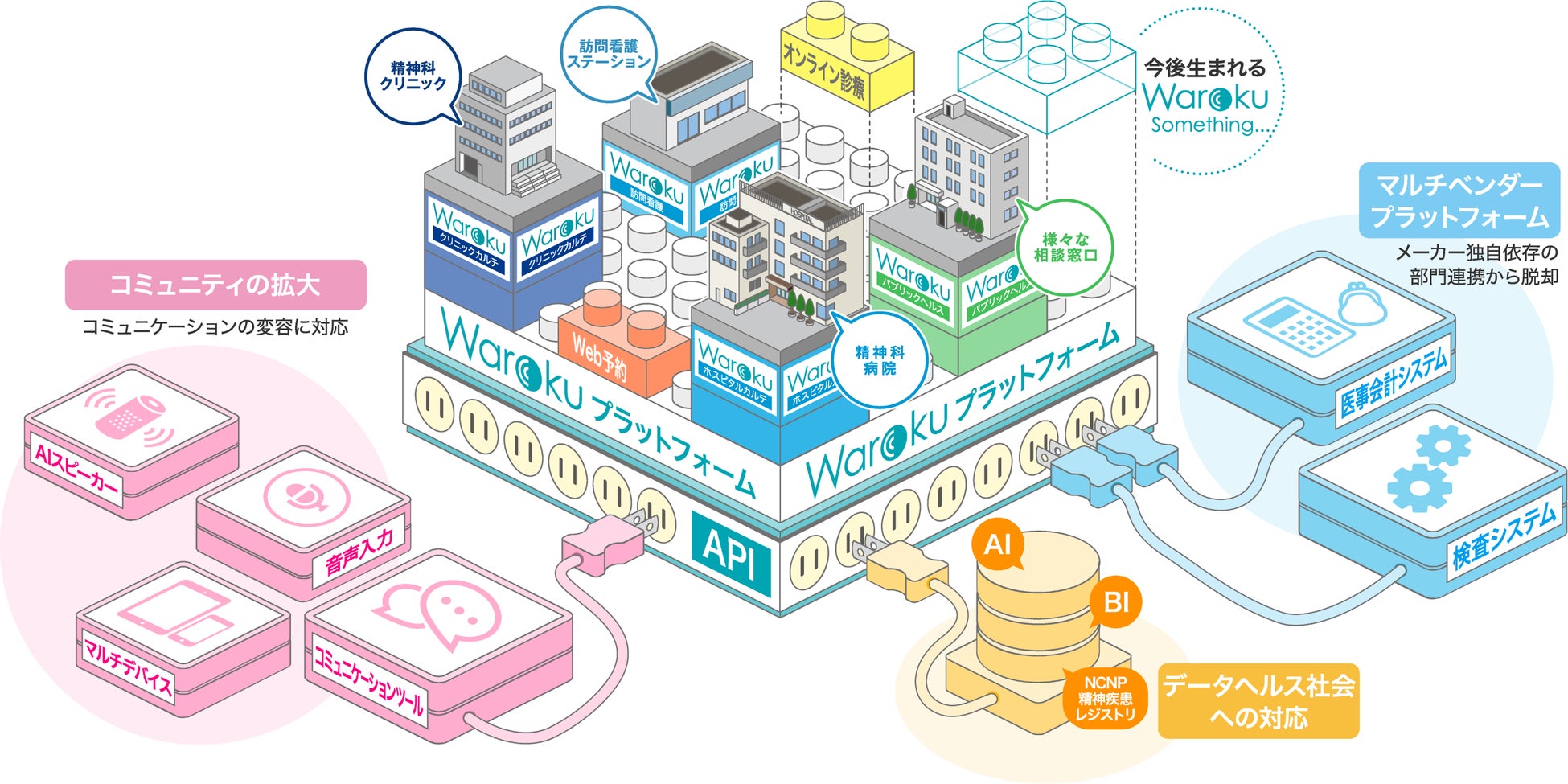 精神疾患予防から通院治療、入院治療、社会復帰、就労定着といったメンタルヘルスケアに関わる全てのステークホルダーが包括的にカルテ情報を共有し、相互コミュニケーションを図ることのできる電子カルテ、それが地域カルテです。地域カルテにおける重要な情報とは、その人のライフログにあたる「成育環境情報」です。個別最適化された生活支援や治療の提供においては、「成育環境情報」の正確かつ詳細な把握・共有が求められますが、地域カルテではクラウド環境を活用することで安全・安心な情報ネットワークを提供することができます。具体的には「Warokuプラットフォーム」というオープンなインターフェースを備えた電子カルテ共通基盤上に様々な用途に応じた電子カルテを実装することが可能であり、個人情報に配慮しつつ統合化された情報の利活用が可能となります。その第1弾が精神科病院向けの新しい電子カルテ「Warokuホスピタルカルテ」であり、2022年2月14日にリリースしました。今後、「Warokuプラットフォーム」版の新しい訪問看護電子カルテなど、順次提供を予定しています。