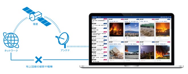 「Spectee Pro for TDSC」は、衛星ブロードバンドサービス「PLANET-BB」のオプションサービスとして提供。発災時には、災害時の光回線・キャリア回線の破断でも使用可能な「PLANET-BB」サービスを用いてSpectee Proサービスに接続し、災害時に確実かつ瞬時にスムーズな情報収集が可能となります。