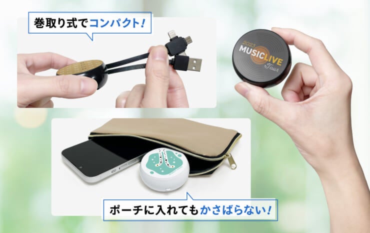 イベントのロゴをプリントして、限定グッズを制作していただくのもおすすめ。また、コンパクトなオリジナルUSBケーブルは物販スペースを圧迫しないほか、会場に運んだり陳列したりする手間が軽減できます。