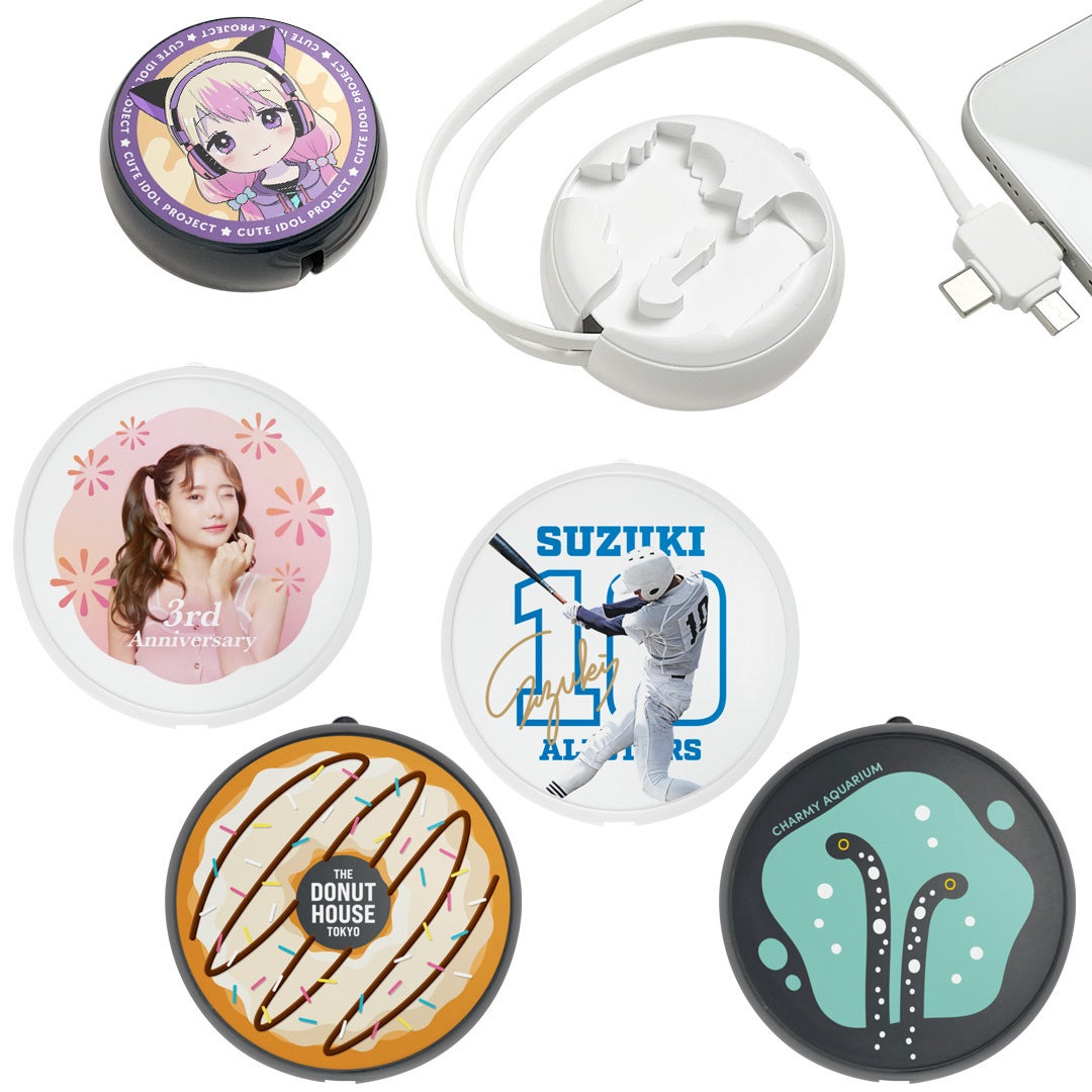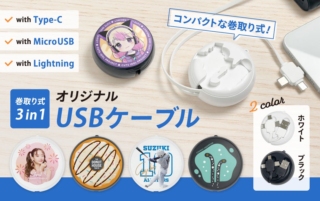 使用頻度の高いオリジナル USBケーブル(巻取り式/3in1)は、いくつあっても活用できるため、アイドルやアーティストのライブ・コンサートグッズとして複数のデザインを展開して販売いただけます。
