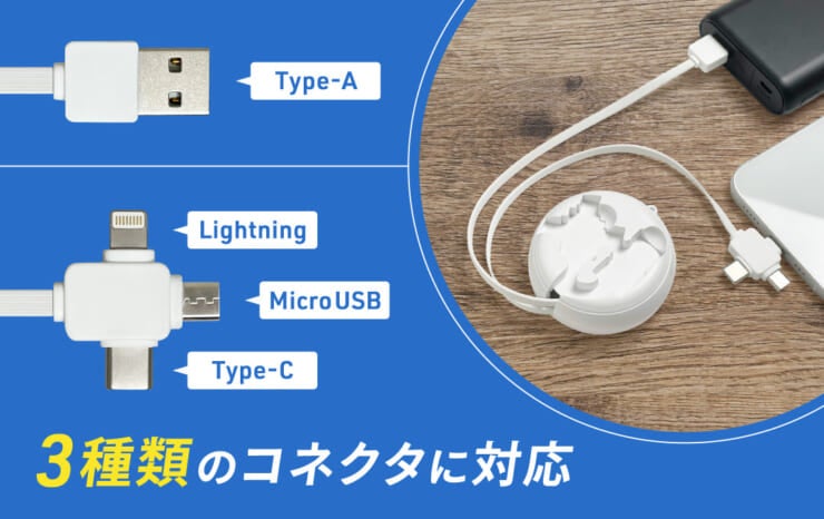 コンパクトなオリジナルUSBケーブルは、「Lightning」「USB Type-C」「MicroUSB」の3つの端子を備えた優秀アイテム。
