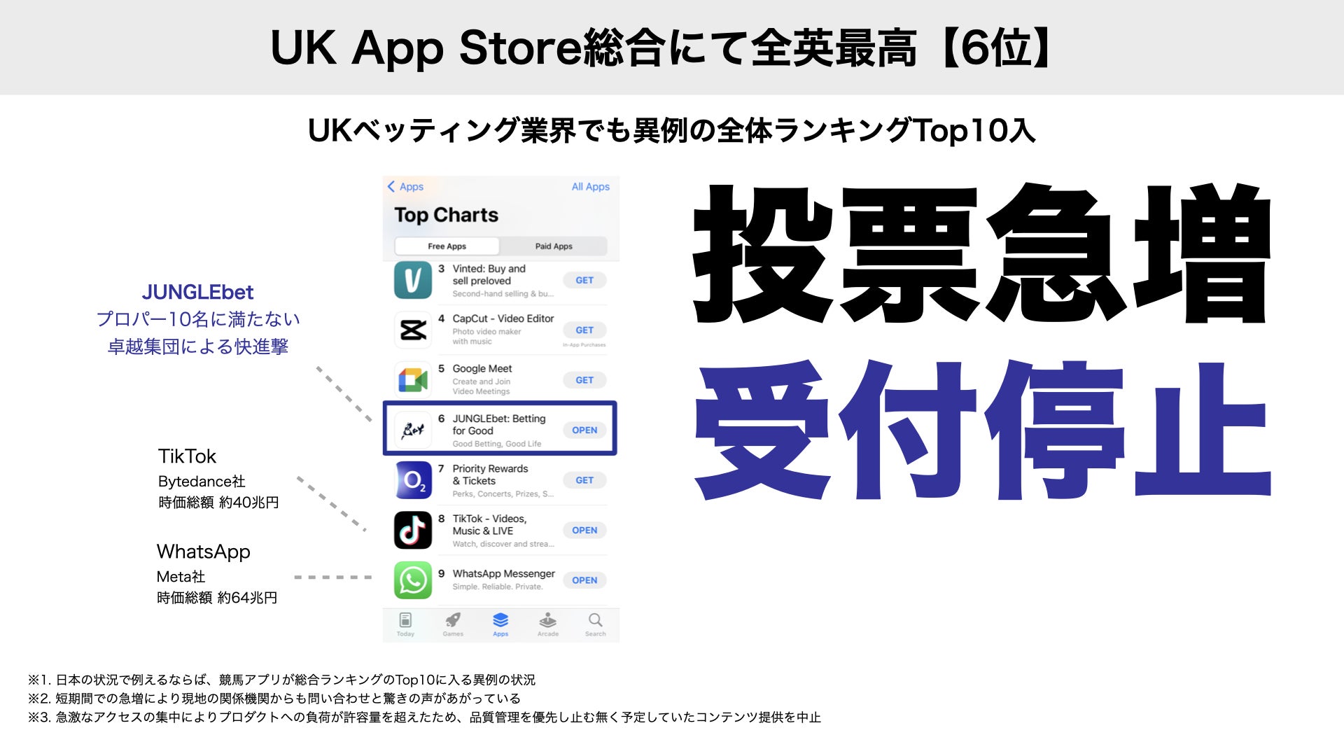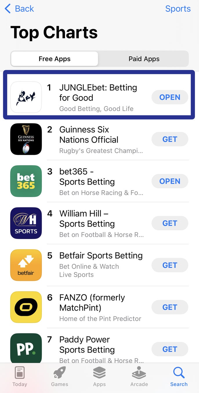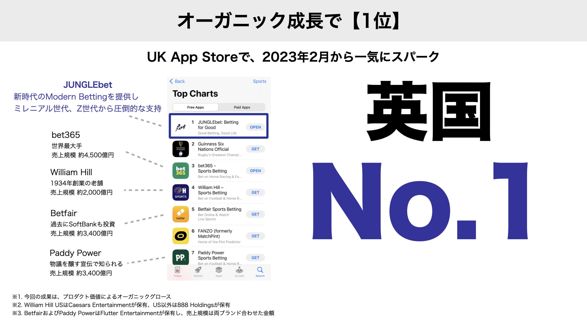 ジャングルX株式会社(本社:東京都港区、代表取締役:直江文忠、以下 「ジャングル」)は、英国で展開しているスポーツベッティングアプリ「ジャングルBet」が、オーガニック成長だけでUK App Store内スポーツカテゴリで、ランキング【1位】を獲得したことをお知らせいたします。