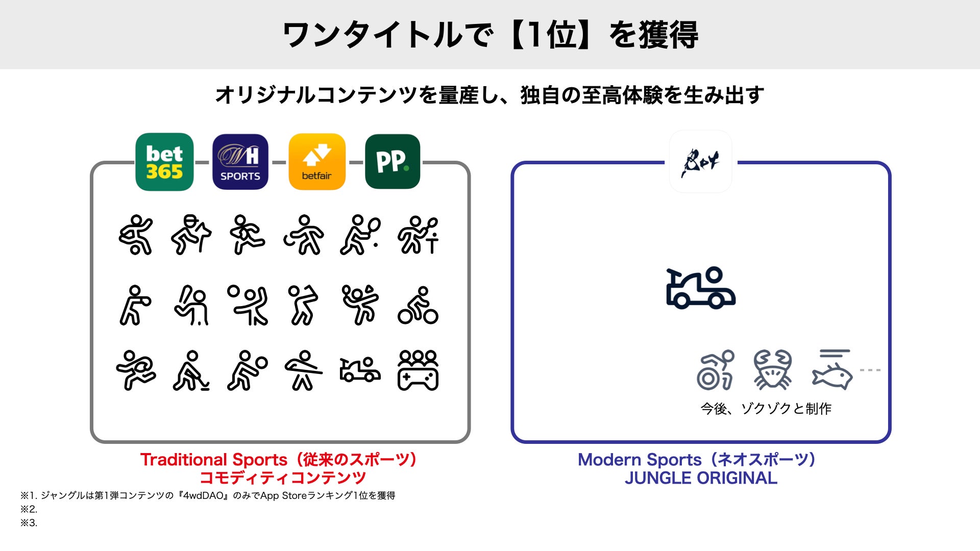 通常、スポーツベッティング各社はPremier League、NBAなど数百から数千のリーグ・大会をコンテンツの対象にしておりますが、ジャングルは自社制作のオリジナル競技で、わずかワンタイトル、1競技のみでランキング【1位】を獲得しております。
