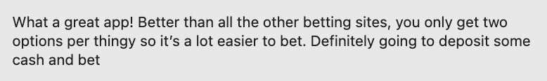 スポーツベッティングの本場英国で目の肥えたお客様からも、競合他社と違って遊びやすい旨のコメントを数多くいただいておりますので、その一部を翻訳と共に仮名にてご紹介します。
