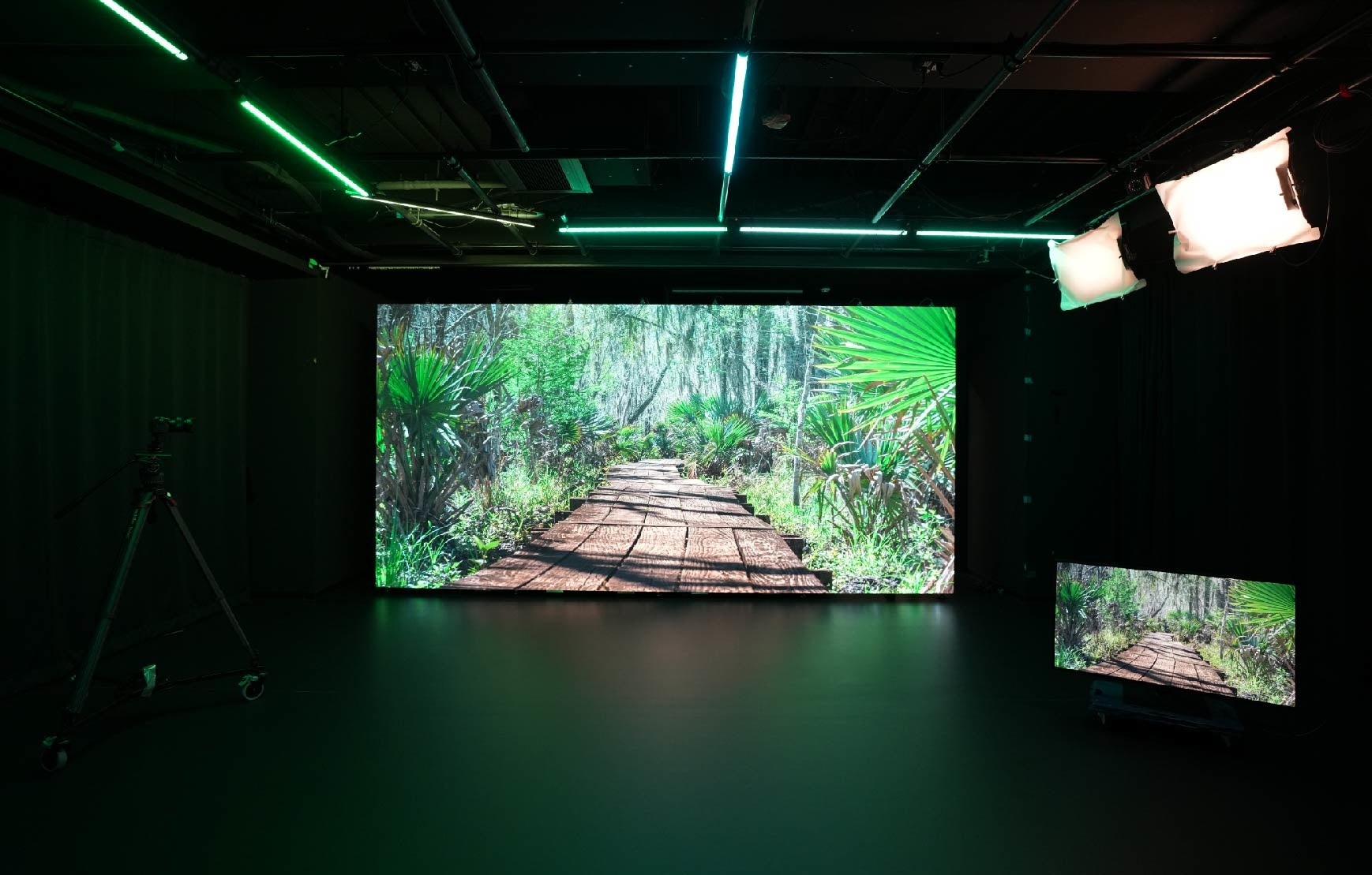LEDウォール(またはLEDボリュームとも呼ばれている)は、バーチャルプロダクションでの撮影に用いられる大型のLEDディスプレイで、ディスプレイ自体が照明を兼ねる事もあり、リアルタイムでの合成のクオリティが高いことが特徴の一つとされています。