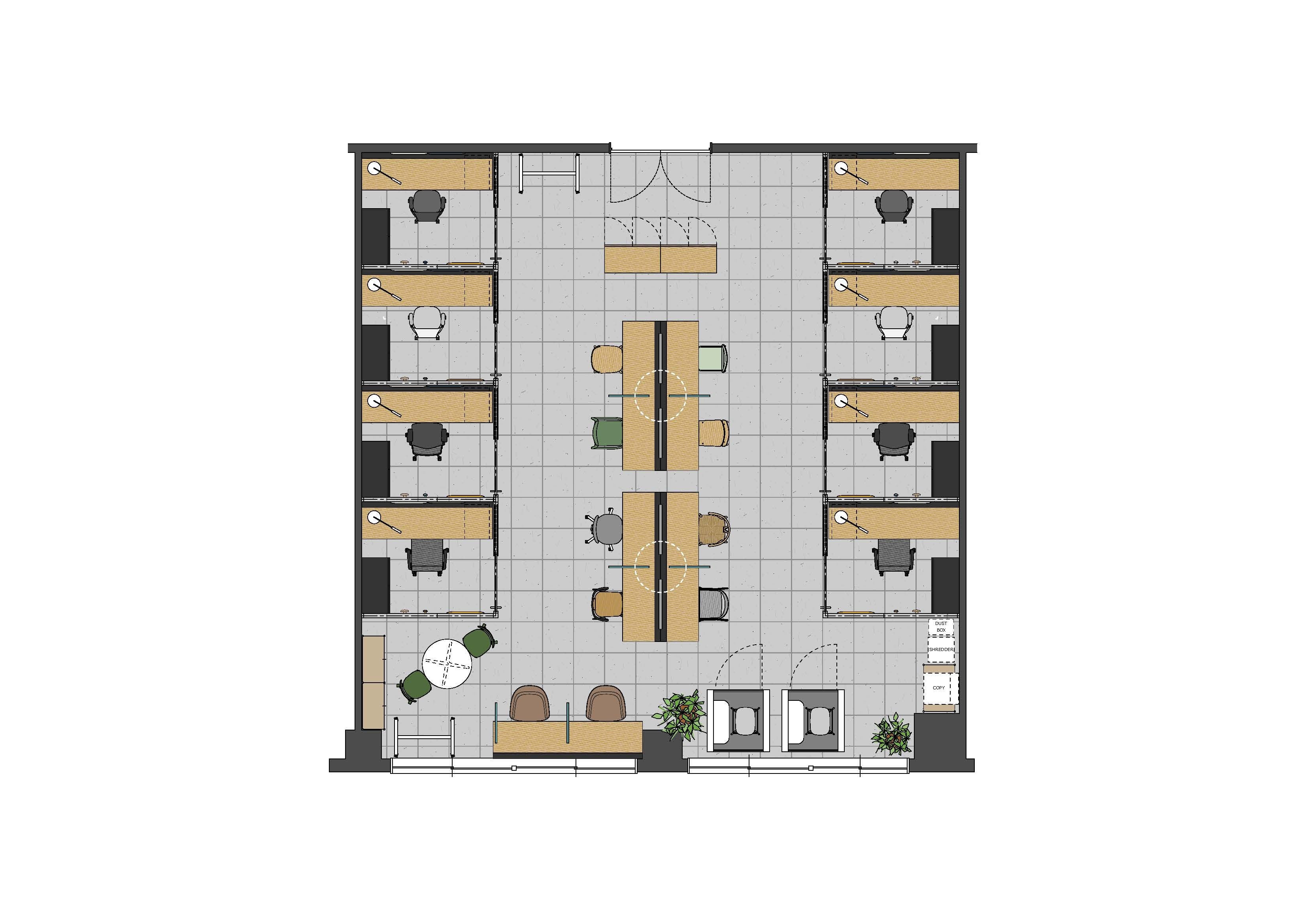 パーティションで区切られた個室空間とカフェのようなシェアオフィスが交わる空間