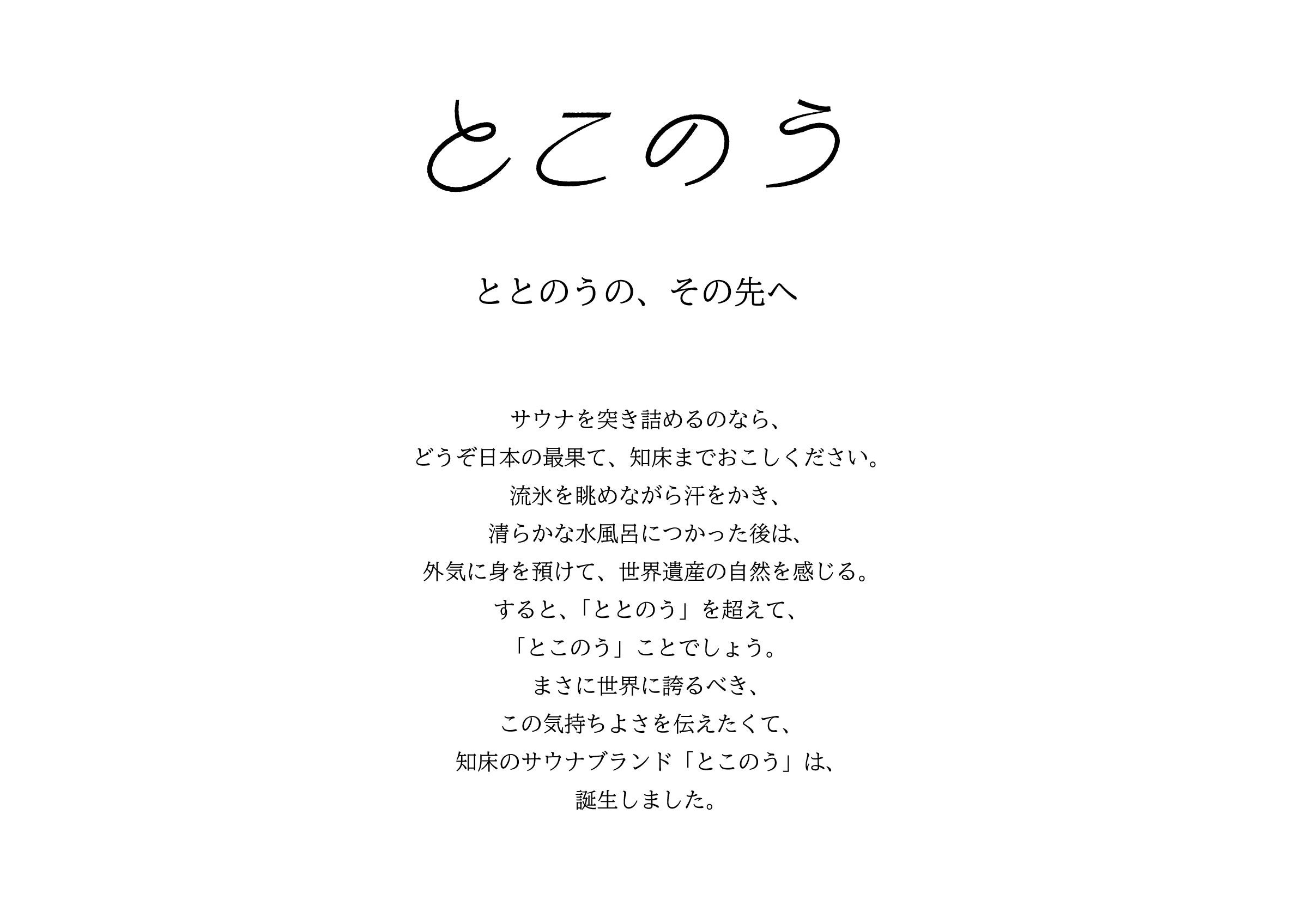 北海道はサウナの聖地・本場フィンランドの気候とよく似ており、特にここ知床は北海道のなかでも北欧・カナダと緯度が近いことから、KIKI知床を運営する北こぶしリゾートは、知床を「サウナの聖地」にすることを目指しております。その中で誕生したオリジナルサウナブランド『とこのう』は、「知床」と「ととのう」(サウナで心身ともにととのった状態を指す)を掛け合わせた言葉で、知床でしか味わえないサウナ体験を表現しております。