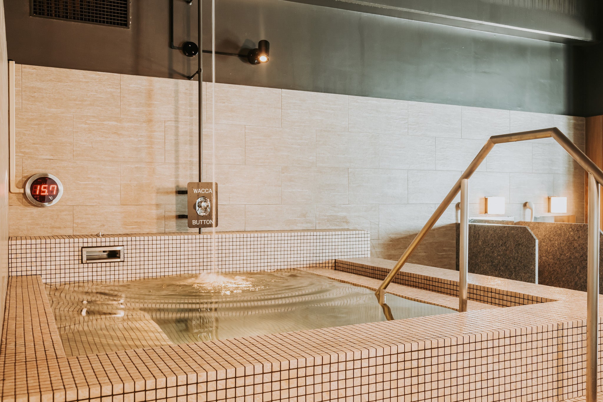 水風呂は、深さ120cmの浴槽が男女ともに完備。ボタンを押すと頭から水が被れる仕掛けもご用意しています。さらに温泉は、 塩化物泉のやさしい泉質、3種の温度の浴槽を構え、どなたでもくつろいでいただけます。自分に合ったお湯を見つけて、心ゆくまで疲れを癒していただければ幸いです。