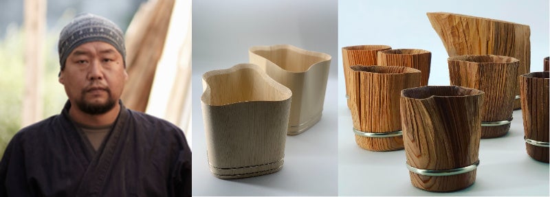 700年以上続く木桶の箍締め技法を用いた作品制作をしている中川木工芸比良工房。「YORISIRO」シリーズは、木の自然な曲がりをそのまま表現することで割れやゆがみを起こさないように木桶として再構築。また、「Wave」シリーズは、テコの原理を使うことで上方にタガをなくし自由な波型を表現している。
