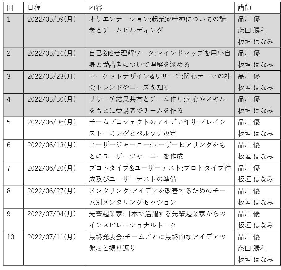 講座では、社会課題を自分ごとと捉え、解決するために必要となる起業家精神を学び、さらに自身のアイデアからどのように事業を生み出すかをチームで学び実践する、全10回(予定)の連続講座となっています。