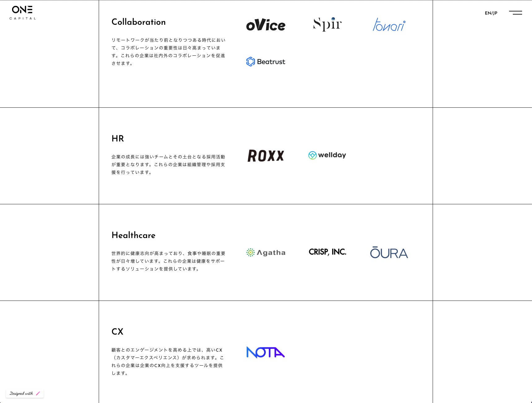 弊社では現在、14社のスタートアップへ投資しております。こちらのページでは、カテゴリ別に投資先を掲載しています。https://onecapital.jp/partnership