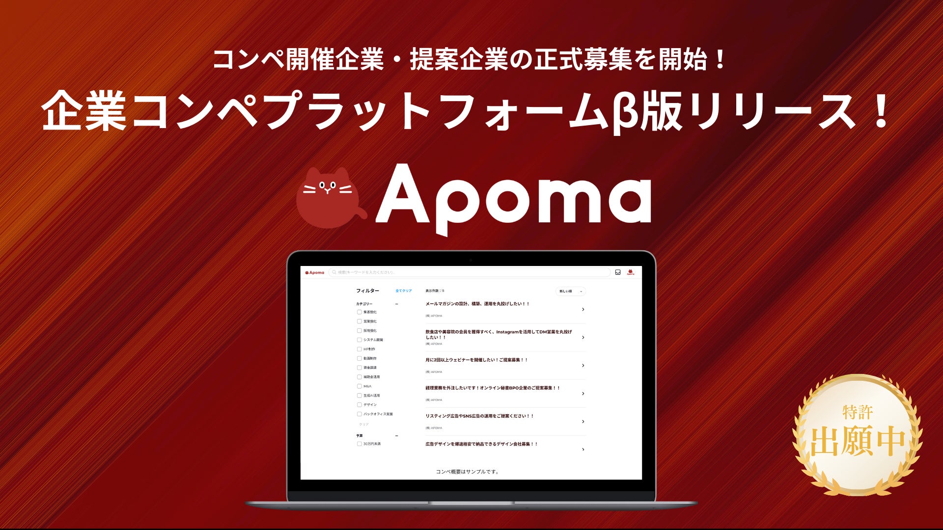株式会社APOMA(本社:東京都港区、代表取締役:白江勝行)は、企業コンペプラットフォーム『APOMA(アポマ)』のβ版を公開し、会員の正式募集を開始しました。