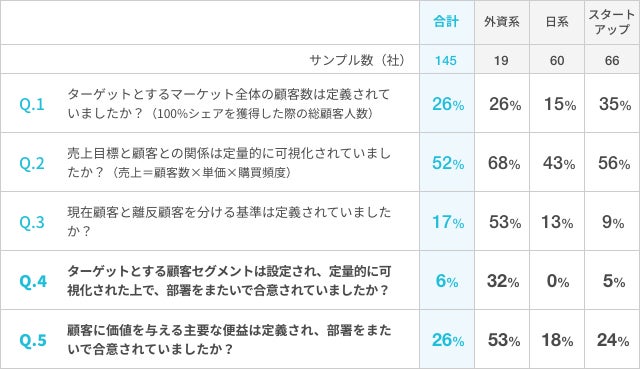 【調査概要】M-ForceおよびM-Forceのパートナー共同で、 過去に自ら担当もしくはコンサルティングや投資先として関わった計145事業において、経営上で最も重要と考えられる顧客理解とその実行に関する5つの質問に回答