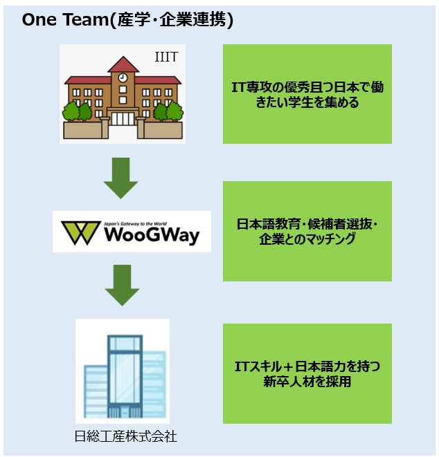 本プロジェクトは、WooGWay株式会社がIT専攻のインド人学生に日本語教育を実施し、International Institute of Information Technology(IIIT)が日本で働きたい学生を選抜。さらに、日総工産株式会社(本社:神奈川県横浜市港北区、代表取締役:清水竜一)が、ITスキルと日本語力を兼ね備えた人材を採用するという、産学・企業が連携した独自スキームです。