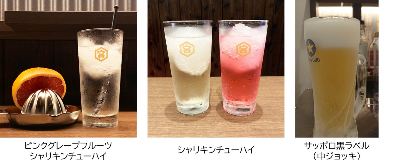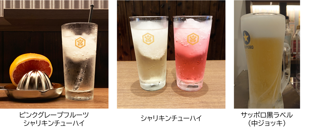 ドリンクも関西ではまだまだ希少な「シャリキンチューハイ」などの看板ドリンクをはじめ、キンキンに冷えたサッポロ黒ラベル中ジョッキを429円というお得な価格で提供します。飲み放題メニューも多彩にご用意しています。