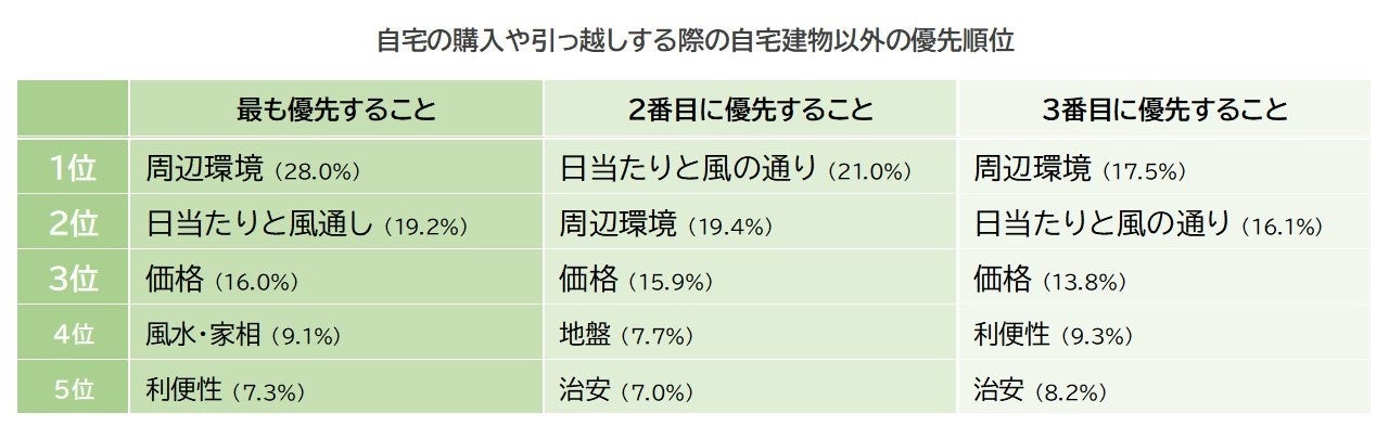 【調査】自宅の購入や引っ越しの際の優先順位 3位「価格」、2位「日当たりと風通し」、1位は○○ 専門家が解説!「運気を最大化するために必要な家の外の○○とは」