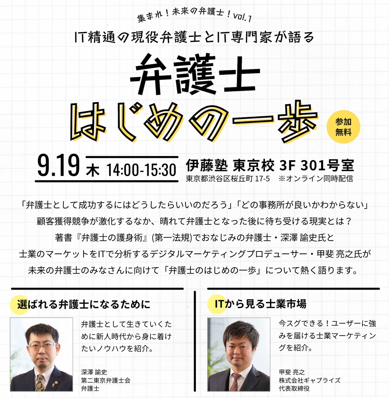 2024年9月19日(木)、一般社団法人士業適正広告推進協議会(所在地:東京都渋谷区 代表理事:櫻井光政)は、未来の弁護士となるべく司法試験受験を目指す学生を対象に「弁護士 はじめの一歩」と題したセミナーを開催させていただきます。