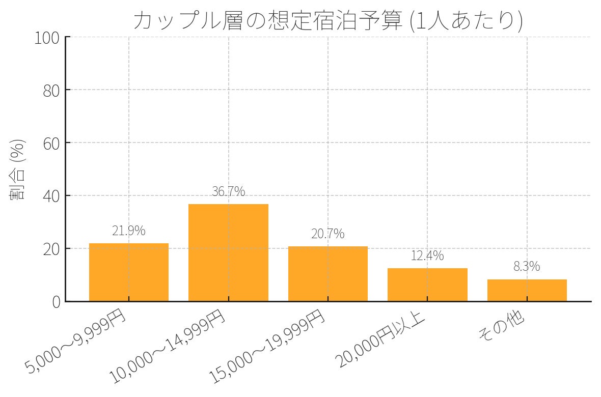 注目すべきは、カップル層の「15,000円以上」の価格帯を選ぶ割合(33.1%)が、全体平均と比べて高い傾向にあることです。これはカップル層が特別な体験に対してより多くの出費を惜しまない傾向を示しています。