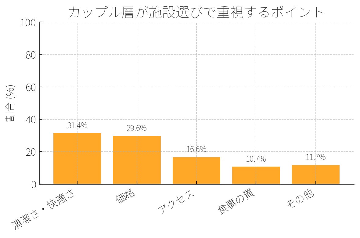 特筆すべきは、カップル層が「施設の清潔さ・快適さ」を全体平均(23.3%)よりも高く評価していること。これは快適な空間でリラックスしたいという願望の表れと言えるでしょう。また、「食事の質・バーベキュー体験」を重視する割合も全体よりも高くなっています。
