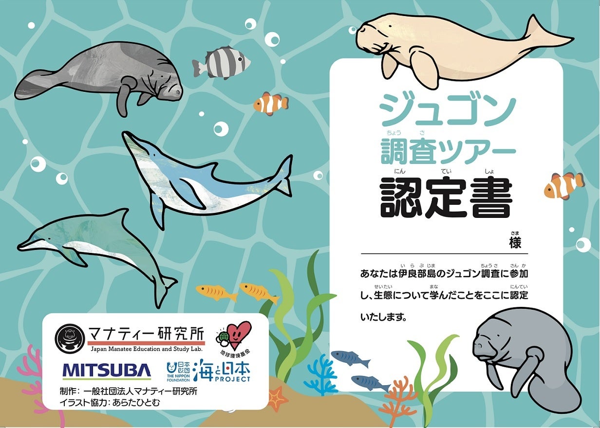 参加者特典として、「ジュゴン調査ツアー認定書」を配布しています。この認定書には、2名の著名なイラストレーターが魅力的なイラストを描いてくださいました。