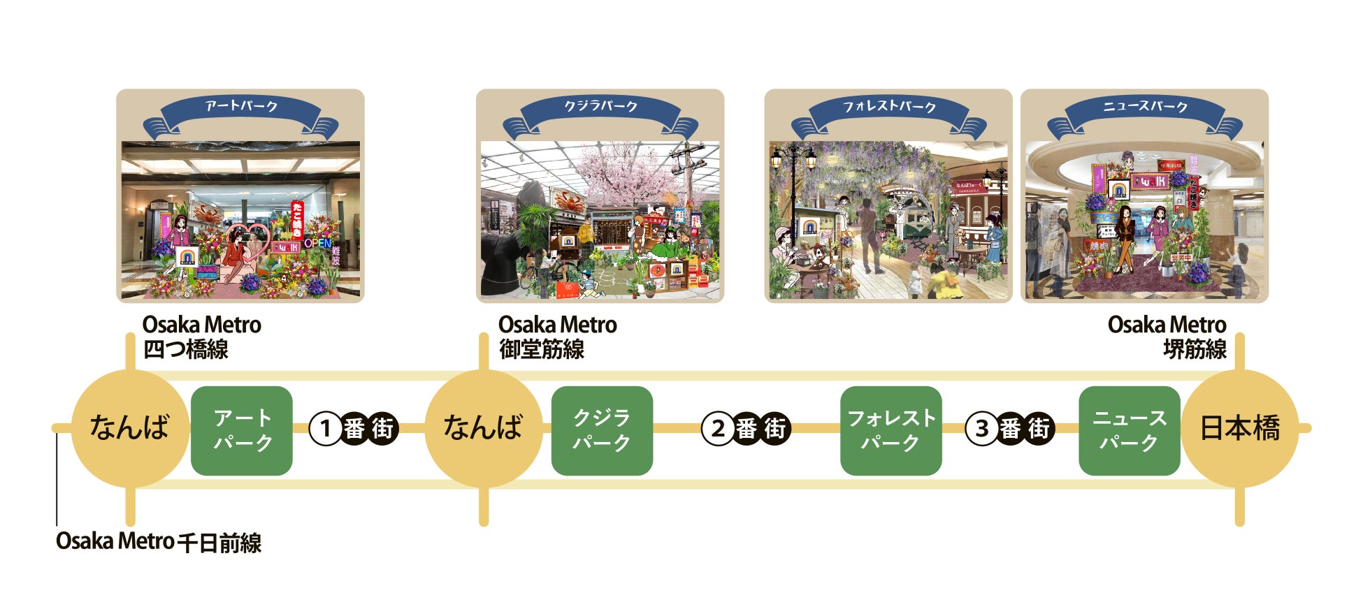 なんばウォーク内 「アートパーク」「クジラパーク」「フォレストパーク」「ニュースパーク」