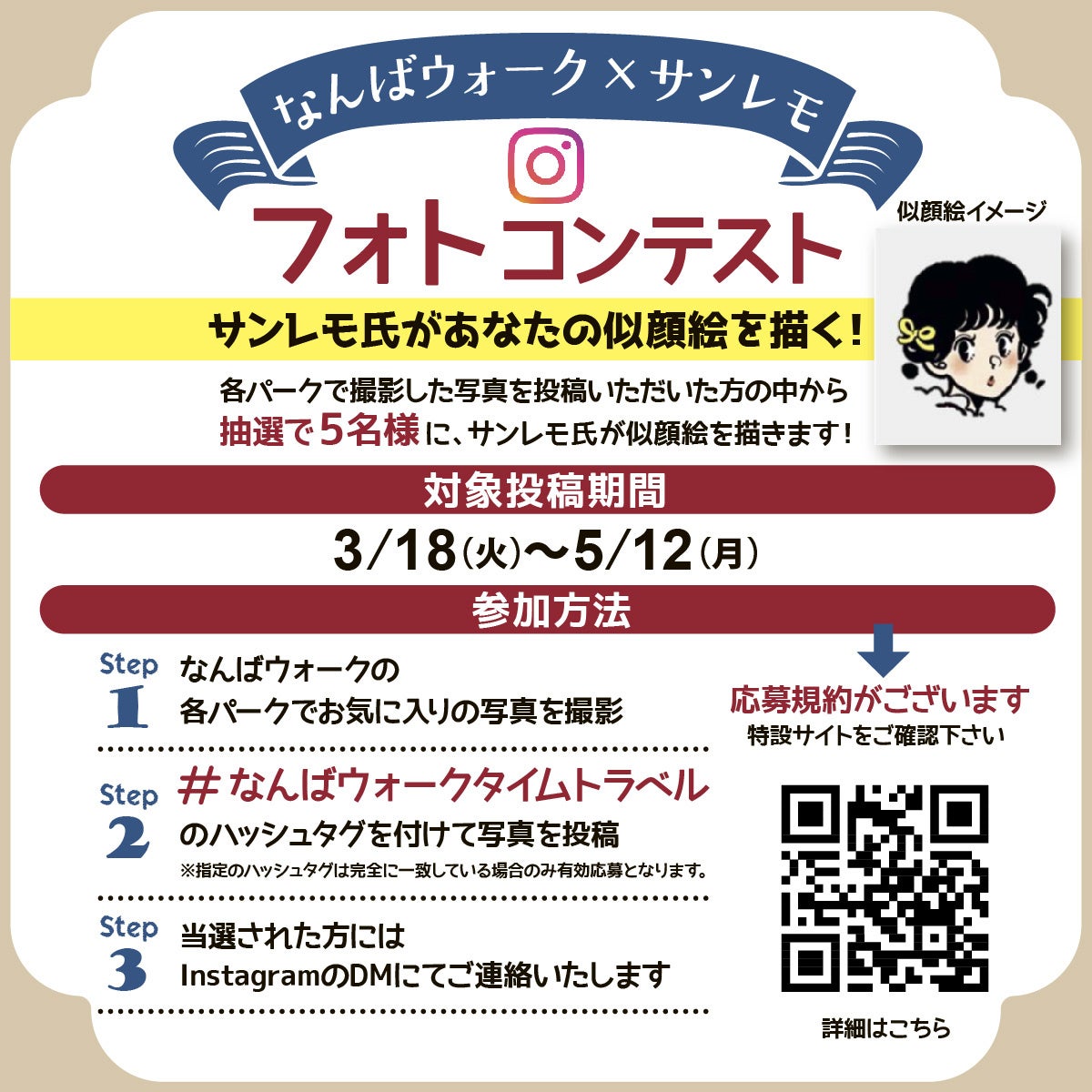 なんばウォーク装飾内で撮影した写真に「#なんばウォークタイムトラベル」を付けてInstagramにて投稿頂いたお客様を対象に抽選で5名様にサンレモ氏があなたの似顔絵を描いてくれるフォトコンテストを開催致します。
