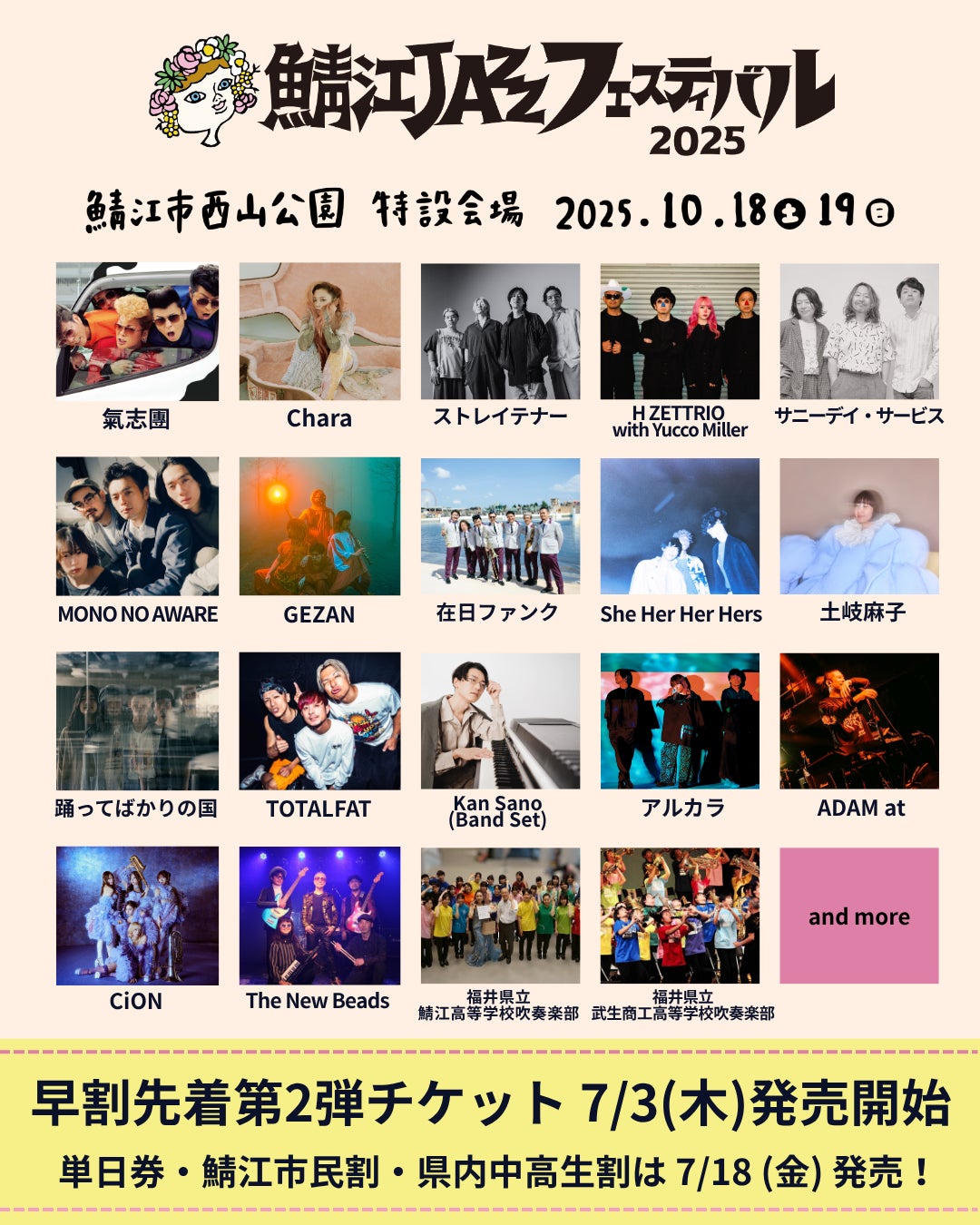 福井県鯖江市「日本の歴史公園100選」認定のさばえのシンボル公園である西山公園にて10月18日(土)19日(日)の2日間「鯖江JAZZフェスティバル2025」(略称:サバジャズ)の早割先着第2弾チケット発売を、7月3日(木)12:00より開始した。「サバジャズ」は、インディペンデント・カルチャーこだわりの鯖江スタイル音楽フェスをコンセプトとする音楽フェスティバルで、2025年が記念すべき初開催となる。初年度にもかかわらず、すでに注目のアーティストが続々と出演決定。出演アーティストには、氣志團、Chara、ストレイテナーをはじめ、計19組がラインナップに名を連ねており、今後の追加アーティスト発表にも大きな注目が集まっている。ジャンルを問わず多彩なアーティストが出演予定であり、音楽ファンにとって見逃せない2日間となることは間違いない。