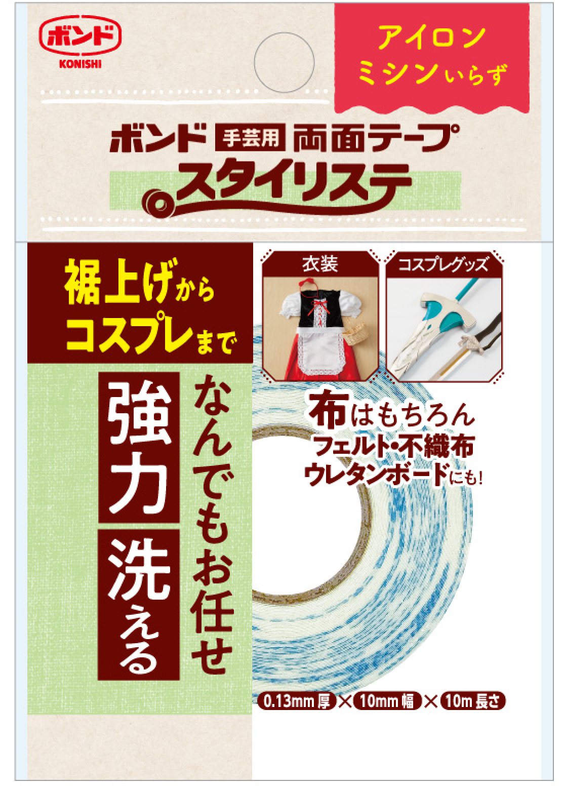 コニシ株式会社(本社:大阪府大阪市、代表取締役社長:大山 啓一)は、様々な用途に使用できる「ボンド 手芸用両面テープ スタイリステ」を2023年12月1日(金)より新発売いたします。アイロンやミシンを使わずに強力接着ができ、洗濯も可能な手芸用両面テープです。「裁縫が苦手だけどズボンのすそ上げがしたい」「ミシンがないけど子どもの衣装を作りたい」などの裁縫用途以外にも、金属やウレタンボードなどの様々な素材に接着できるのでコスプレ用の小道具なども作れます。全国の手芸店やホームセンター、量販店、ネット通販等で販売いたします。