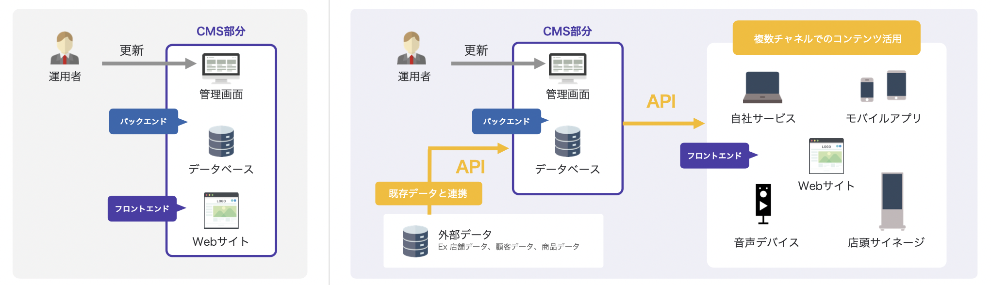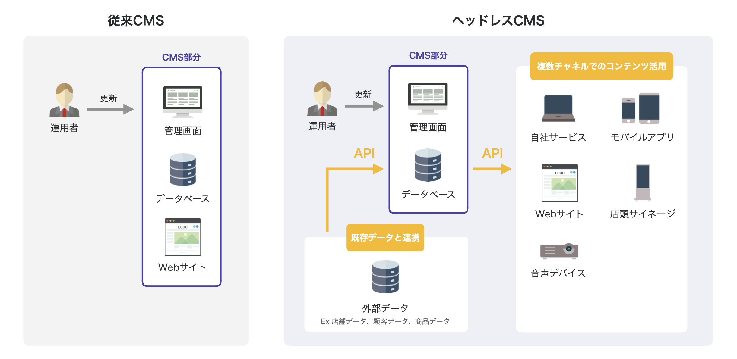 従来型のCMSはコンテンツの管理に加えて、表示面がセットになっています。それに対してヘッドレスCMSはヘッド(表示面)がなく、APIによってコンテンツを配信するのが特徴です。