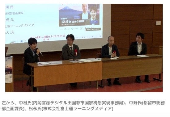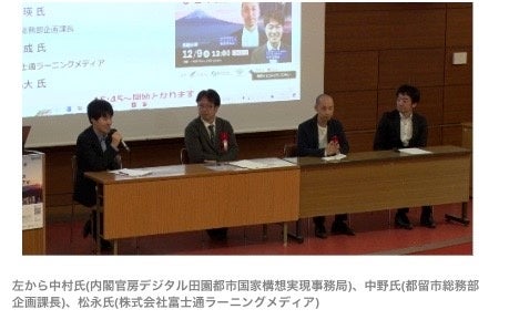 トークセッションには、中村智瑛氏(内閣官房デジタル田園都市国家構想実現事務局)、中野一成氏(都留市総務部企画課長)、松永昂大氏(株式会社富士通ラーニングメディア)が登壇。生涯活躍のまちの実現に向けて、国、地方自治体、企業の代表者3名をお迎えして、地域社会の発展に向けたパネルセッションが行われました。