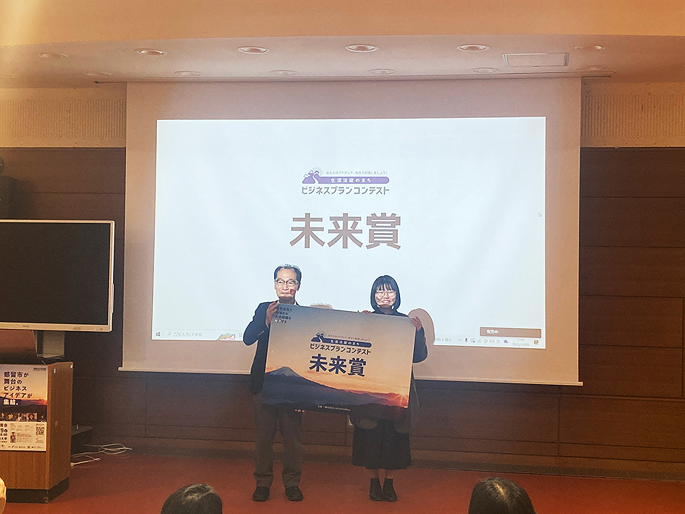 本コンテストは、今年で4回目を迎え、内閣府、経済産業省、山梨県、山梨県都留市からの後援を経て、都留文科大学にて開催されました。6組のファイナリストによるプレゼンテーションが行われた他、国・地方自治体、企業の代表者をお招きし、「企業力と地域力がひとつに。生涯活躍のまち、未来への道」と題したトークセッションも同時に開催されました。