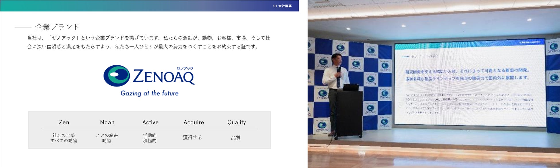 ゼノアック 事業開発部・内山 晋です。弊社、日本全薬工業株式会社の紹介をさせていただきます。主に動物用医薬品の研究・販売・製造を一貫して行っている企業であり、主な販売として、動物病院や畜産の診療所、畜産関係の方々を対象とした事業を展開しています。また、企業ブランドとして「ゼノアック」(「Zen=社名の全薬」、「Noah=ノアの箱舟」、「Active=活動的」、「Acquire=獲得する」、「Quality=品質」)という企業ブランドを掲げ、より多くの方々に価値を提供すべく日々活動にあたっています。