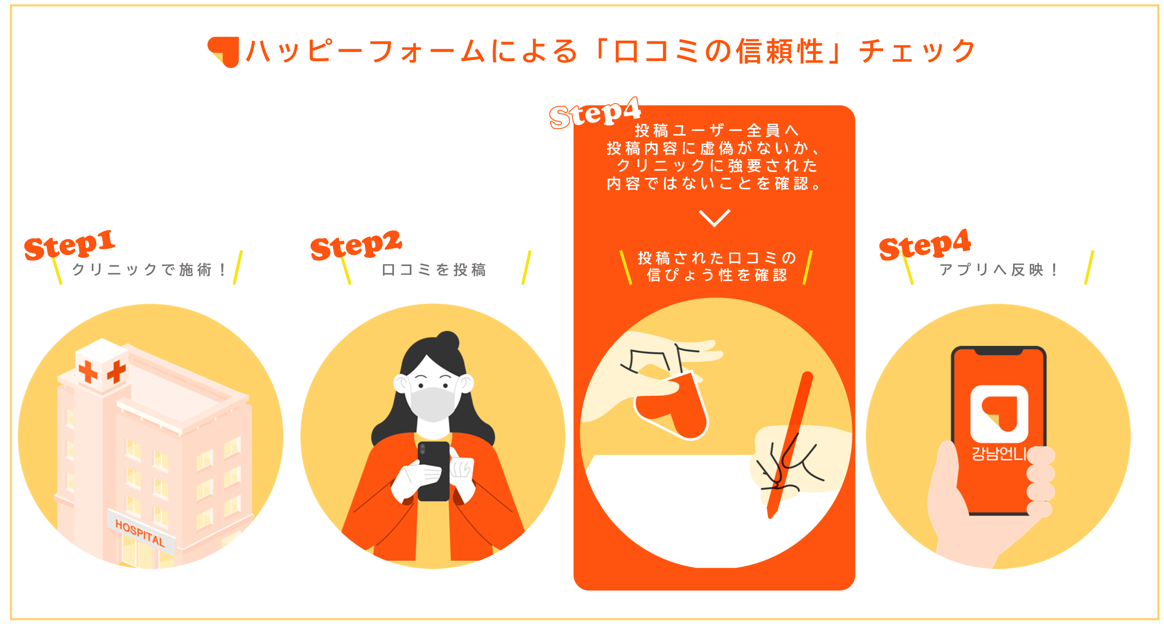 "カンナムオンニは真実を伝えることを追求します。" 美容医療・整形アプリ「カンナムオンニ」ハッピーフォームを導入し、投稿された口コミの信ぴょう性を確認。